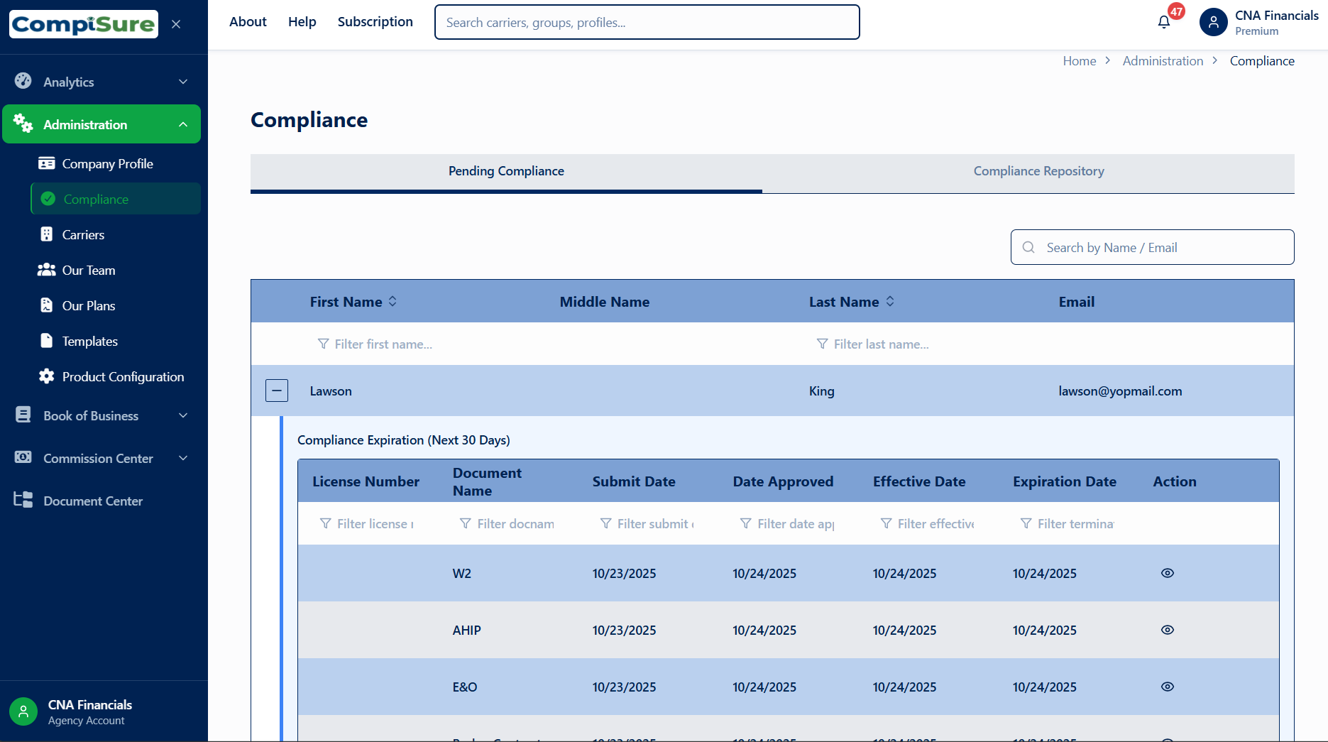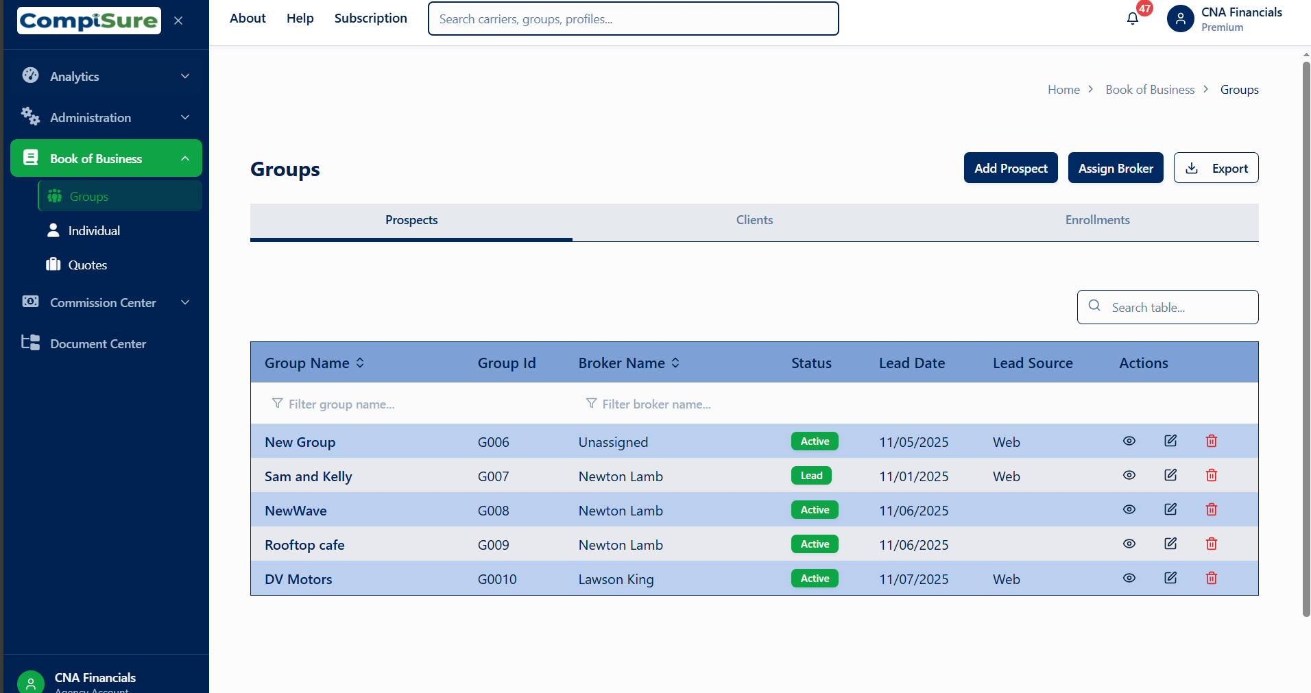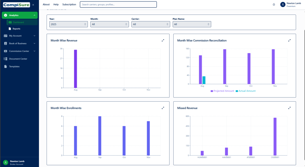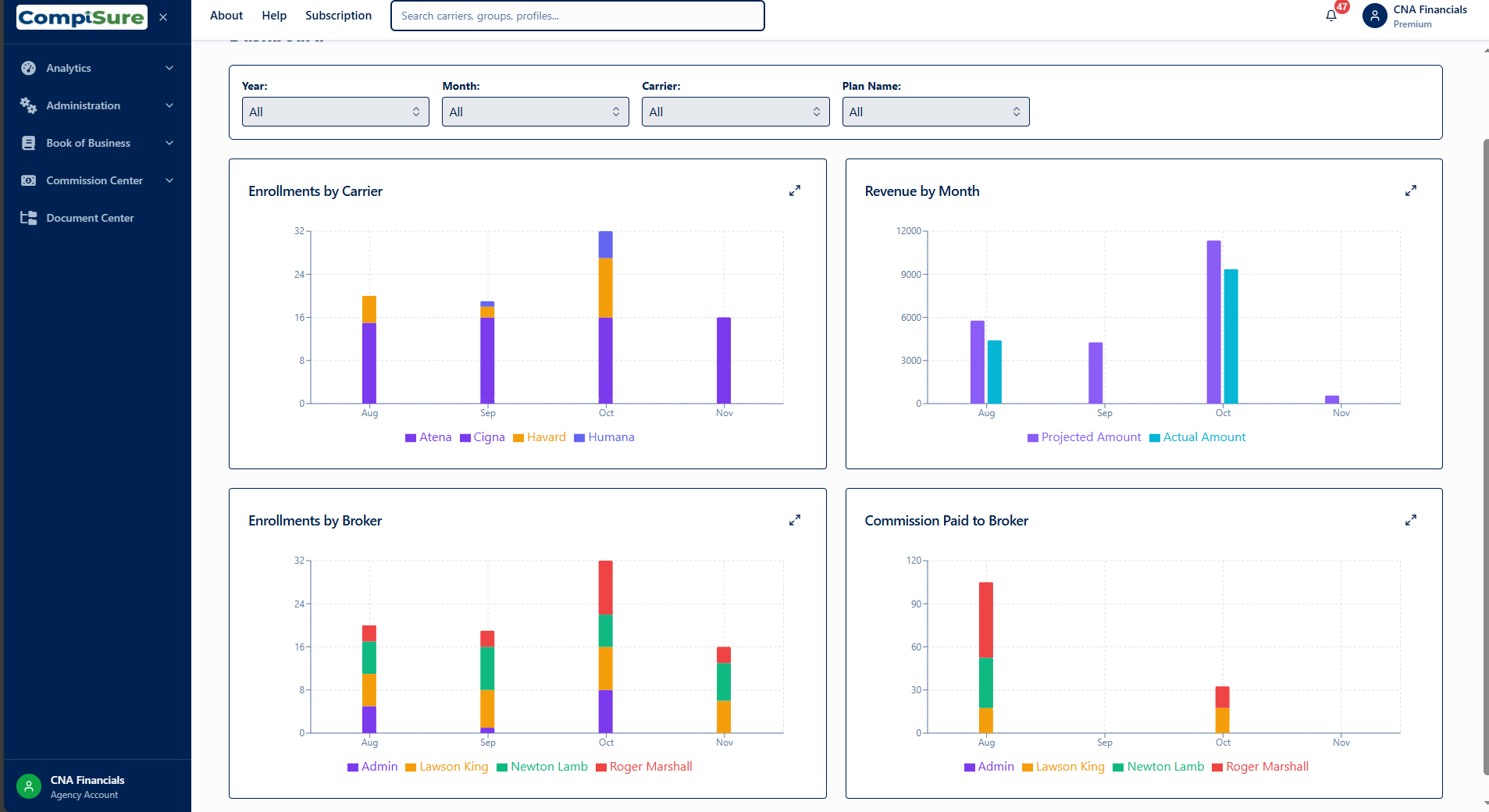 CompiSure includes commission tracking, enrollment management, revenue analytics, broker portals, document storage, and comprehensive reporting tools – everything to run your insurance agency efficiently.